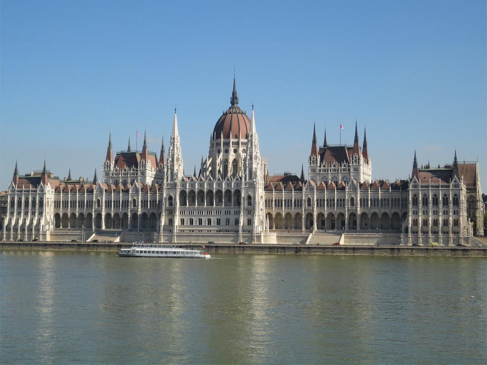 Das ungarische Parlament am Pester Donauufer, gesehen vom Batthány tér an der gegenüberliegenden Flußseite. In 17 Jahren (!) wurde 1885 bis 1902 das größte Parlamentsgebäude der Welt in neogotischem Stil errichtet, als Symbol der mit dem österreichisch-ungarischen Ausgleich 1867 erreichten autonomen Staatlichkeit.