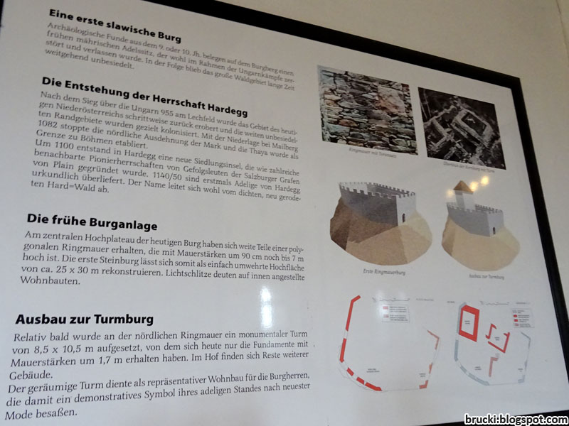 Die Burg Hardegg wurde erstmals im Jahr 1145 schriftlich erwähnt. Der Burgberg dürfte im 11.Jh. besiedelt worden sein. 1041 konnten die Babenberger die Grenze ihres Herrschaftsgebiets zur Thaya erweitern, eine hölzerne Wehranlage zur Kontrolle des Flussübergangs entstand. Die Burg war das Herrschaftszentrum der Grafschaft Hardegg, die ab 1294 nachweisbar ist. Als Grenzfestung wurde die Anlage ausgebaut. Die Adelsgeschlechter, die von hier aus über die Menschen der Gegend herrschten, wechselten sich ab. Ab 1730 herrschten hier die Grafen und späteren Fürsten Khevenhüller-Metsch, die aber ihren Wohnsitz in das neugebaute Schloss Riegersburg verlegten. Seit damals wurde die Burg kaum mehr bewohnt und verfiel. Beim Brand der Stadt Hardegg im Jahr 1764 durften die Bewohnerinnen und Bewohner Steine und Holz der Burg zum Wiederaufbau ihrer Häuser entnehmen. Schon 1754 waren als Bauholz für die Erbauung der Pfarrkirche Dachstühle und Böden abgetragen worden. Ab 1878 ließ der damalige Fürst die Ruine nach romantischem Stil der Zeit teilweise wiederaufbauen. Hardegg ist eine der größten und ältesten Burgen Niederösterreichs.