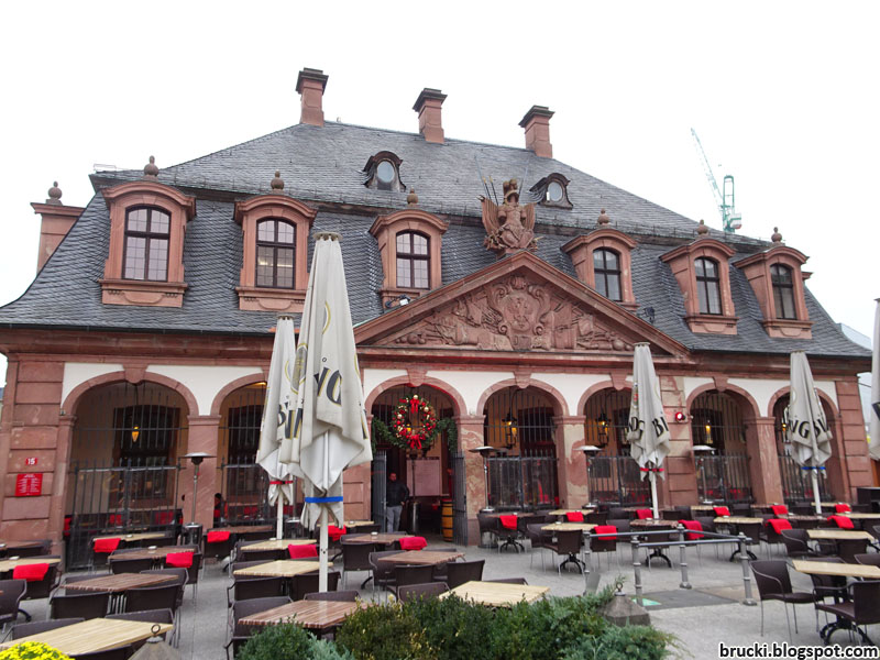 Der Gebäudekomplex Römer ist seit dem 15.Jh. das Rathaus Frankfurts. Das mittlere der hier links zu sehenden ursprünglich drei eigenständigen Gebäude am Römerberg ist das eigentliche Haus zum Römer. Die Bombardierungen Frankfurts im Zweiten Weltkrieg ließen nur die drei Fassaden stehen. Dahinter verbirgt sich der Neubau eines modernen Bürohauses im Stil der frühen 1950er Jahre. Die Häuser rechts wurden mit einer an das alte Aussehen erinnernden Fassade wiedererrichtet.